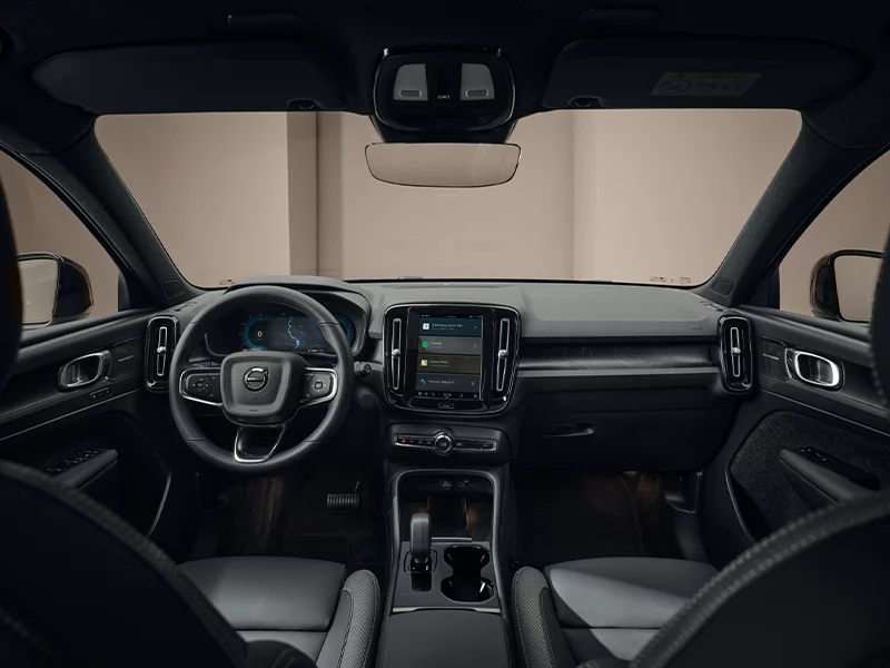 Het interieur van de EX40 weerspiegelt Volvo’s visie op duurzaamheid: volledig leer-vrij, met hoogwaardige gerecyclede materialen en een minimalistische, Scandinavische uitstraling. Bijzonder detail is het verlichte Topography-decor, geïnspireerd op Abisko National Park. Standaard vind je een panoramadak, slimme opbergoplossingen, Google Built-in, Apple CarPlay en een premium Harman Kardon-geluidsinstallatie.